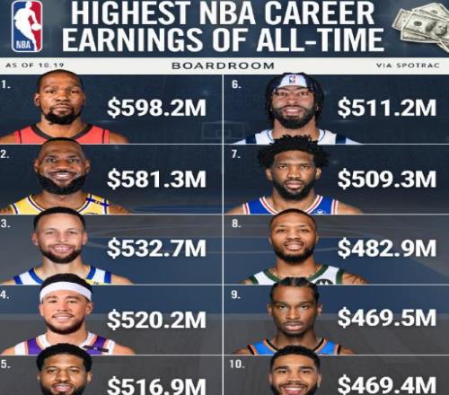 10月20日,根据美国薪资网站Spotrac数据,刚刚和火箭完成提前续约的杜兰特,职业生涯总薪水达到5.982亿美元,超越詹...