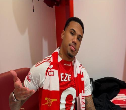 英超第12轮北伦敦德比,阿森纳主场4-1大胜热刺,因伤缺阵的枪手后卫加布里埃尔赛后晒出他反穿埃泽球衣手拿全场...