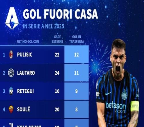 意甲球员2025年客场进球榜:普利希奇12球第1,劳塔罗11球第2