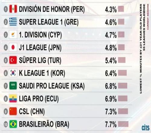 根据CIES的统计,中超联赛以7.3%的U21球员出场时间占比,在全球55个顶级联赛中位列第9位,反过来说也就是U21球员出场时间,是55大联赛中倒数第9多的。 中超赛场上,U21球员的累计出场时间,仅占总出场时间的7.3%,表明绝大多数俱乐部在用人上极其保守,更倾向于使用有经验的老将和外援。
