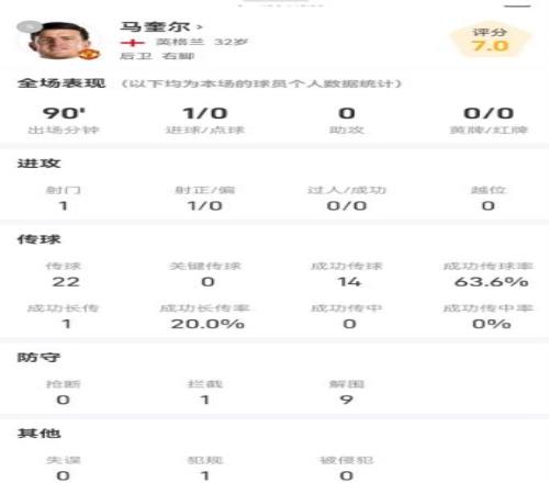 制胜功臣!马奎尔全场数据:破门制胜,9次解围闪耀防守端