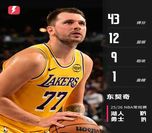 难救主!东契奇今日27投17中狂轰43分12板9助2断1帽 雷速体育 2025-10-22 13:02:50 雷速体育10月22报道 今日NBA常规赛湖人109-119不敌勇士。本场比赛湖人球员东契奇出战40分59秒,27投17中,其中三分10投2中,砍下43分12篮板9助攻2抢断1盖帽3失误1犯规的数据。 湖人勇士NBA常规赛卢卡·东契奇 上一篇: 萧华:25总决赛收看人数高于24年,因为比赛更激烈了下一篇: 湖人真不能没有詹姆斯!哪怕詹黑都知道他太强!