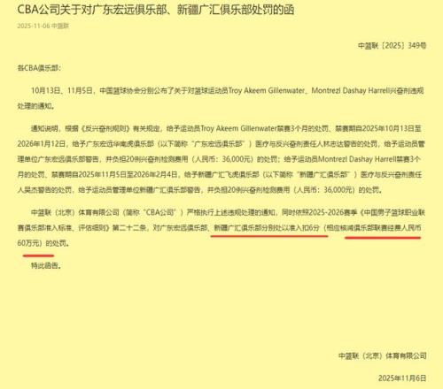 重拳出击!继中国篮协对广东宏远队和新疆队外援兴奋剂违规做出处罚之后,CBA也及时进行追加处罚:准入扣6分+60万元的罚款,球迷拍手叫好!