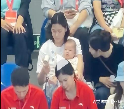 全红婵看台上抱娃助威,陈艺文林珊为广东跳水摘得第五金
