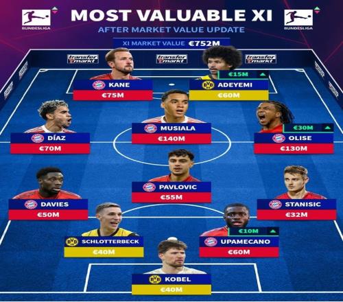 德转列德甲最贵阵容:穆西亚拉1.4亿领衔,拜仁和多特包揽11人